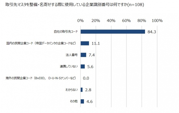 取引先マスタを整備・名寄せする際に使用している企業識別番号は、「自社の取引先コード」が84.3%と最多で、次いで「国内の民間企業コード」が11.1%、「法人番号」が7.4%と続きました。