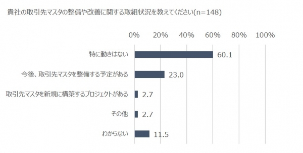 「特に動きはない」が60.1%と最多でしたが、約4分の1は「今後、取引先マスタを整備する予定がある」との回答であり、デジタルトランスフォーメーションの実現に結びつく取り組みを予定しているようです。