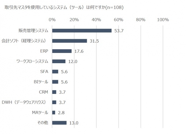 取引先マスタを使用しているシステムについては、「販売管理システム」が53.7%と最多で、次いで「会計ソフト(経理システム)」が31.5%、「ERP」が17.6%、「ワークフローシステム」が12.0%と続きました。「SFA」「BIツール」「CRM」「DWH」「MAツール」は少数回答となりました。