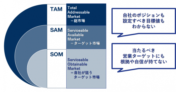 営業戦略を立案するうえで、SWOT分析や3C分析を用いて“市場を把握”し、STP(セグメンテーション・ターゲティング・ポジショニング)を明確にして“市場のどこを攻めるのか”を明確にし、4P(Product:製品、Price:価格、Place:流通、Promotion:販売促進)の観点から具体的な施策を検討する流れが一般的です。この考え方は理解しているものの、BtoB企業のマーケティングや営業推進部門の方と意見交換をするなかで、どのように市場を定義するかというTAM・SAM・SOM(※)を明確にすることができないことが悩みであるという声を多く聞きます。TAMとは「獲得可能性のある市場全体」、SAMは「TAMの中でターゲティングした自社がサービス提供可能な市場」、SOMは「自社が獲得できる市場」を意味します(図1)。既に取引がある企業やアプローチ済みの企業は当然把握できますが、それ以外でターゲットとなりうる企業がどれくらいあるのか、シェアがどれくらいであるかがわからず、根拠のない営業戦略となってしまうケースがあると聞きます。