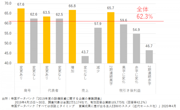 企業の変化を捉えてアプローチすると営業成果につながりやすいのかを裏付けるデータのひとつとして、イベントの有無で設備投資意欲に差があるのかをみていきます。図3は、弊社が実施した「2019年度の設備投資に関する企業の意識調査」をもとに分析したものですが、全体では62.3%の企業が設備投資をすると回答しています。商号変更があった場合は、ない場合に比べて5ポイント意欲が高いことがわかります。また、当然かもしれませんが、業績が伸びている場合は設備投資をしていることが数字にも表れています。