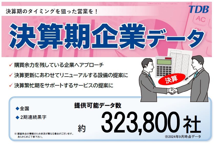 TDBの148万社の企業概要ファイルでは企業の決算期を特定できるため、効果が高まるタイミングをとらえた営業ターゲットとしてリストアップすることが可能です。また、年商規模や地域など複合条件での抽出も可能なので、貴社の独自の状況に合わせた営業ターゲットとして活用いただけます。