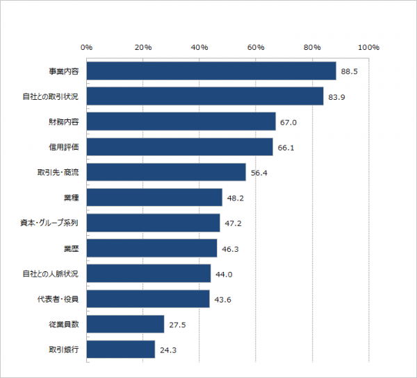 「事業内容」が88.5%と最も多く、「自社との取引状況」が83.9%と続き、この2項目が8割を超える結果でした。これに続いたのが、67.0%の「財務内容」、66.1%の「信用評価」でした。