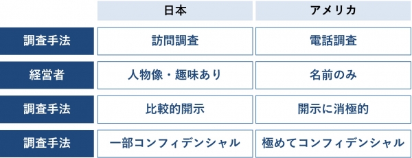 弊社の日本企業の信用調査報告書には、経営者の項目の中に人物像やゴルフなど趣味などプライベートな情報まで記載されていますが、アメリカでは個人的な情報は信用調査の項目にはなく、名前のみの記載という違いがあります。