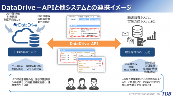 DataDrive APIとはDataDrive BasicCloudと他システムを連携するAPIサービスです(図1)。本サービスはDataDrive内の情報、例えば評点を含むCOSMOS2※3や倒産予測値※4などの情報を、お客さまのシステムへシームレスに連携することを実現するサービスです。