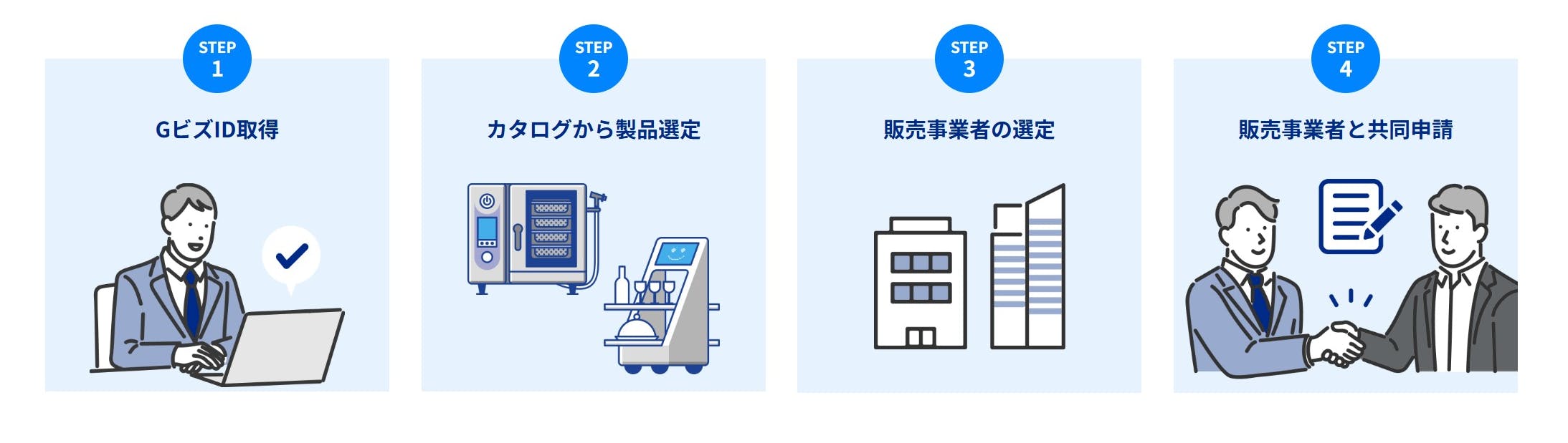 オンラインで行政サービスを利用するための共通ID「GビズID」を取得いただき、公募要領を確認のうえ、カタログから導入したい製品を選定。その後、カタログに記載されている販売事業者と共同で申請書の作成、オンライン申請をしていただきます。
