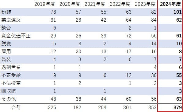 2024年度のコンプライアンス違反倒産は379件で、4年連続で前年度を上回り過去最多となった。業種別では「サービス業」、違反類型別では「粉飾」が最多となった。粉飾決算や各種補助金の「不正受給」の増加が目立つ。