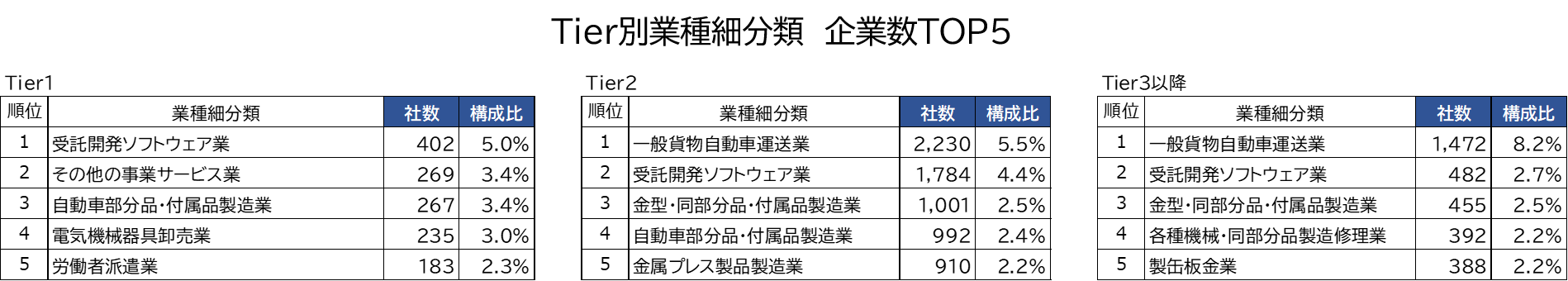 業種別にみると、Tier1は「受託開発ソフトウェア業」が402社で最多となった。以下、「その他の事業サービス業」(269社)、「自動車部分品・付属品製造業」(267社)、「電気機械器具卸売業」(235社)と続いた。Tier2は、「一般貨物自動車運送業」が2,230社でトップ、以下、「受託開発ソフトウェア業」(1,784社)、「金型・同部分品・付属品製造業」(1,001社)が上位となった。Tier3以降でも、「一般貨物自動車運送業」が1,472社でトップ、「受託開発ソフトウェア業」(482社)、「金型・同部分品・付属品製造業」(455社)と続いた。
