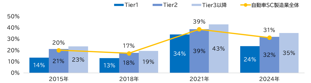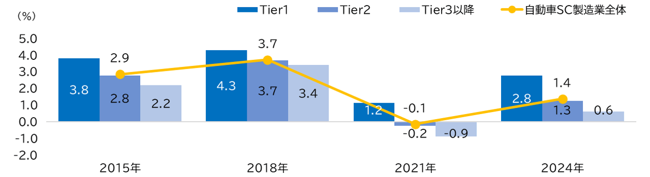2024年の自動車サプライチェーン製造業の本業の儲けを表す売上高営業利益率の平均は1.4%と製造業全体の平均1.8%より0.4ポイント低かった。Tier別ではTier1が2.8%、Tier2は1.3%、Tier3は0.6%であった。完成車メーカー10社それぞれのサプライチェーンで同様の傾向がみられ、Tier3の営業利益率の平均がマイナスとなるメーカーも複数あった。2015年から3年ごとの推移を見ると、2018年はやや上昇したが、2021年に入ると新型コロナによる世界的混乱や半導体不足の影響で大きく低下し、2024年の時点で回復に至っていない。コロナ禍前後を比較すると2018年は全体が3.7%、Tier1が4.3%、Tier2は3.7%、Tier3は3.4%であった。Tier1とTier3の差は2018年の1.3倍から2024年は4.7倍となり、コロナ禍を経て格差が広がった。Tier1は経済環境の変化や生産調整に比較的柔軟に対応しているが、Tier2,3では対応が十分に進まず利益率が低い傾向が見て取れた。