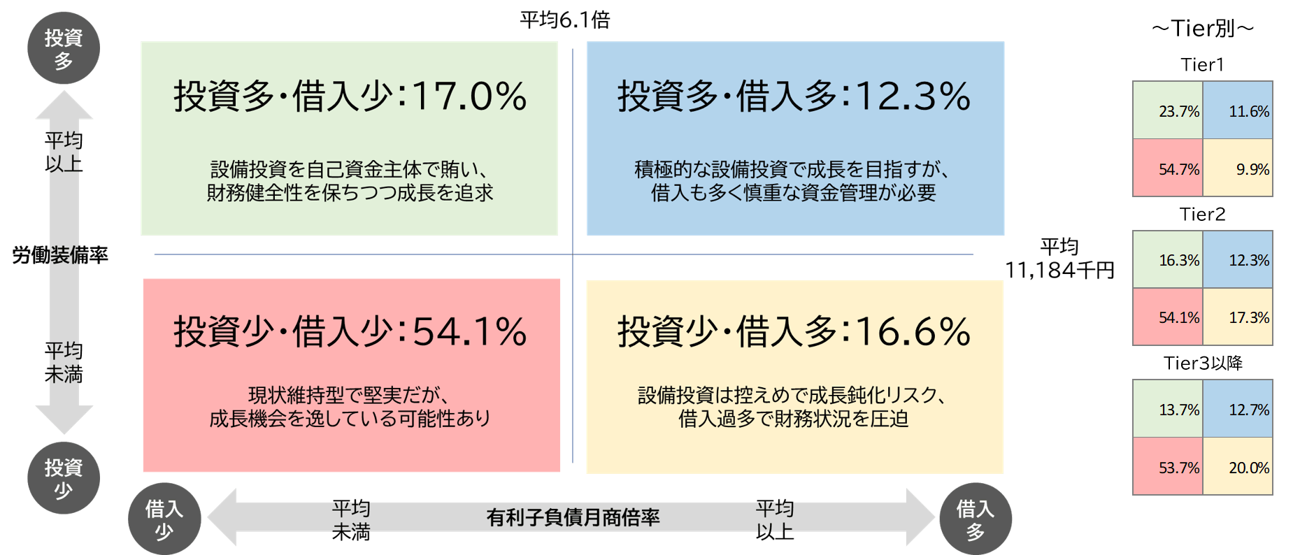 一人当たりの有形固定資産額を表す「労働装備率」を縦軸、借入金が月商の何カ月分に相当するかを表す「有利子負債月商倍率」を横軸にとり、それぞれの平均値を基準として4象限の企業数の割合を算出した。労働装備率が平均よりも高い「投資多」企業は29.3%にとどまった。内訳は自己資金主体で投資を行う「投資多・借入少(左上)」が17.0%、積極的な投資を行うが借入も多い「投資多・借入多(右上)」が12.3%となった。Tier別では、Tier2の「投資多」に分類される28.6%、同様にTier3の26.4%の企業は、さらなる投資拡大や雇用の担い手となり、地域経済のけん引役として積極的に支援していく必要があろう。