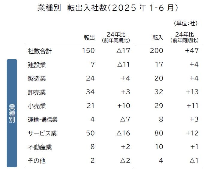 2025年1-6月に地方から首都圏へ本社機能を移転した企業は200社で、過去10年で最多だった。首都圏から転出した企業は150社で前年から減少し、全体では50社の「転入超過」となった。中小企業がビジネスチャンスを求めて首都圏に移転する動きが目立つ。転出企業の業種別では「サービス業」が最多。地方から首都圏への転入企業も「サービス業」が最多で、「卸売業」「小売業」も多い。企業の「脱首都圏」から「首都圏回帰」の動きが見られる。