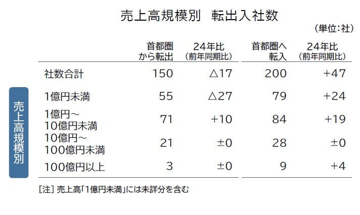 帝国データバンクは、2025年1~6月に首都圏(東京・神奈川・千葉・埼玉:1都3県)⇔地方間をまたいだ「本社所在地の移転」が判明した企業(個人事業主、非営利法人等含む)について、保有する企業概要データベースのうち業種や規模が判明している企業を対象に分析を行った。