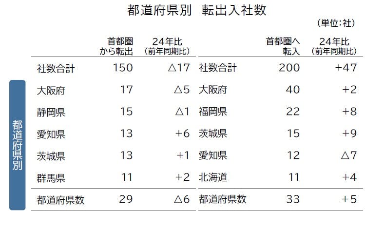 他方、同期間における首都圏からの転出企業は150社で、前年から17社・10.2%減少した。コロナ禍により首都圏外への転出が増加した2021年以降では最少となった。