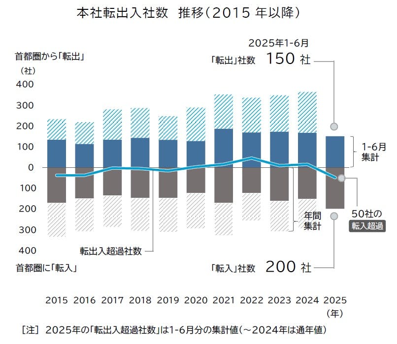2025年1-6月に判明した、地方から首都圏へ本社機能を移転した企業は200社に上った。過去10年で最も多く、前年を47社・30.7%上回る高水準で推移した。このペースが続いた場合、首都圏への企業移転は1990年以降で初となる400社台に到達する可能性がある。