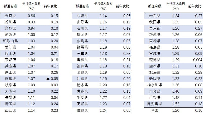 都道府県別にみると、最も平均借入金利が低かったのは「奈良県」の0.86%。以下、「香川県」(0.93%)、「鳥取県」(0.94%)と続く。前年度(2023年度)と比較すると、「徳島県」を除く46都道府県で平均借入金利は上昇した。