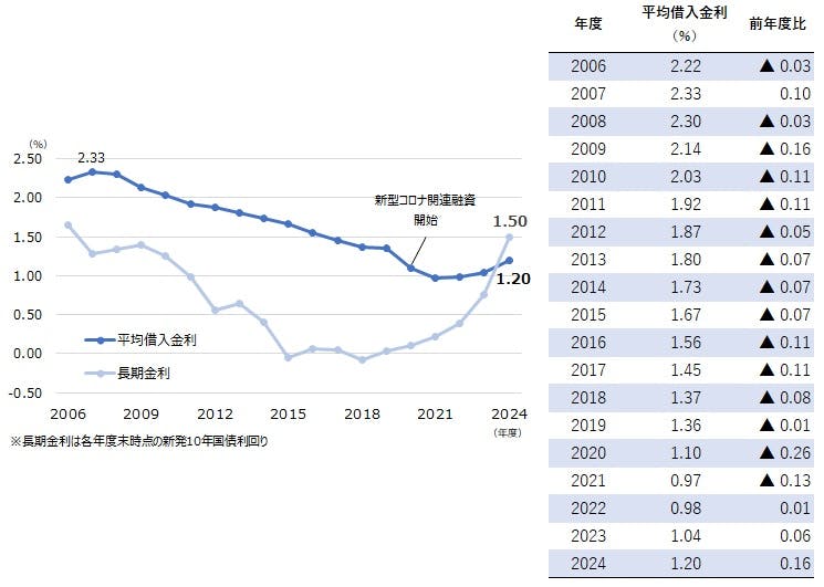 企業の平均借入金利は、2007年度(2.33%)をピークに2021年度まで14年連続で低下し、2020年度には新型コロナに伴う実質無利子・無担保の融資(コロナ融資)拡大で大きな下げ幅となったが、2023年度以降はコロナ融資の借り換えや一般融資における金利上昇などによる影響が表れ、2024年度は長期金利が1%を大きく上回ったことも上昇圧力となった。長期金利が平均借入金利を上回ったのは、2006年度の調査開始以降、初めてとなる。