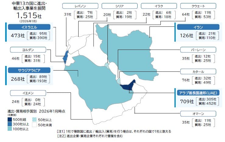 パレスチナを除く中東地域13カ国に進出、または輸出入(貿易)事業(=「中東事業」)を展開する日本企業は、2026年1月時点で少なくとも計1515社が判明した。このうち、駐在拠点や工場など現地に「進出」している企業は469社、輸出入など「貿易」を行う企業は1137社判明した(「進出」「貿易」でそれぞれ重複を含む)。