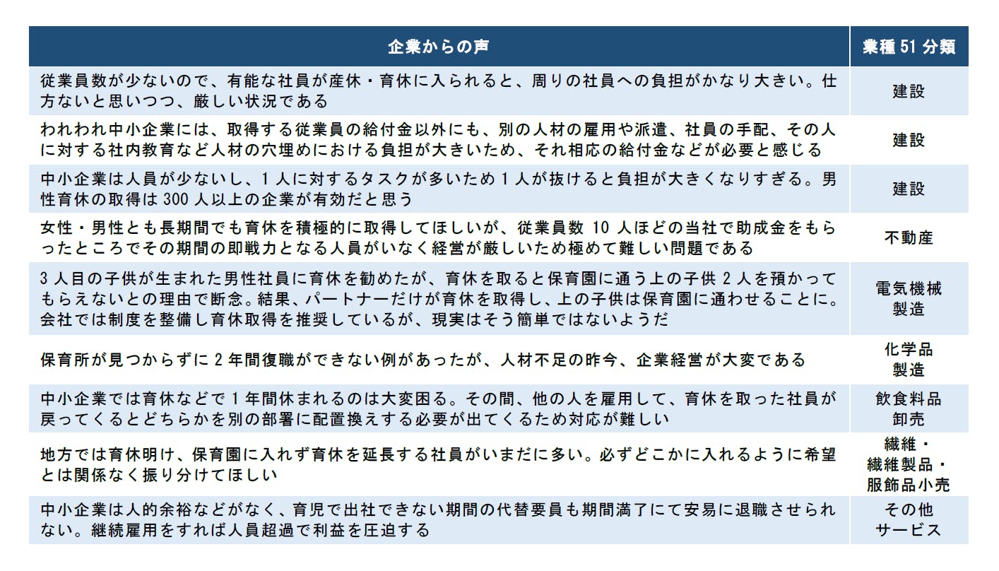 中小企業では、人的余裕やコスト負担が大きな障壁となり、育休制度の利用が進みにくい現状が浮き彫りになっています。このような状況を改善するためには、特に中小企業を中心に、政府による助成金制度の拡充など支援策の強化が必要です。それに加えて、子育てをしながらでも働きやすい環境の整備など、男女が仕事と家庭を両立できるよう支援する幅広い施策も求められます。