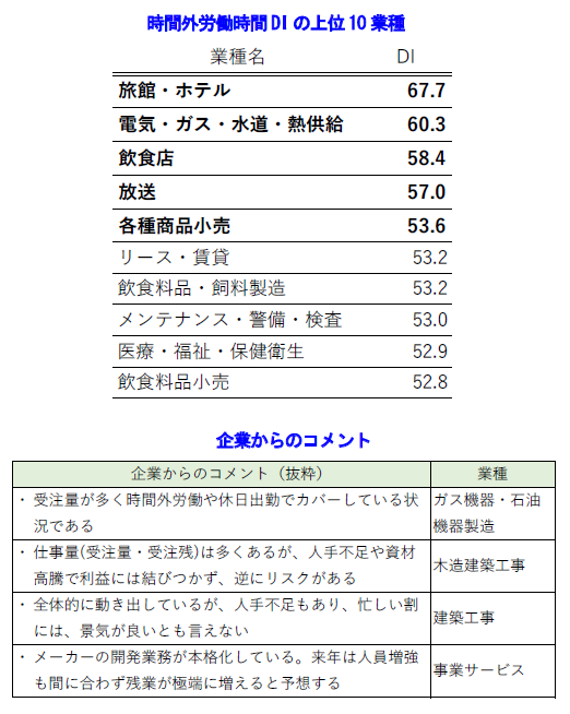 2. 10業界中6業界、51業種中33業種で悪化した。仕入単価DIが10業種で最高水準となるなど原材料価格の高止まり傾向に加え、新型コロナの感染者数の増加も悪材料となった。また「旅館・ホテル」などを筆頭に人手不足や超過労働が深刻となっている。