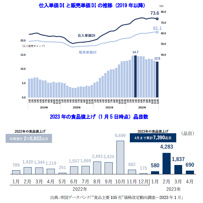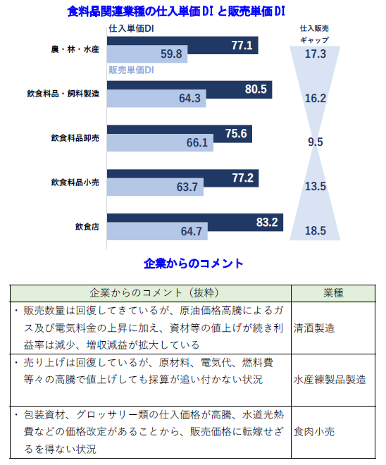 • 食品値上げが続くなか、食料品関連業種では川上、川下の双方で仕入販売ギャップは高まっている。今後も値上げの余地が大いにある