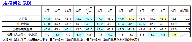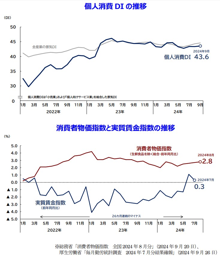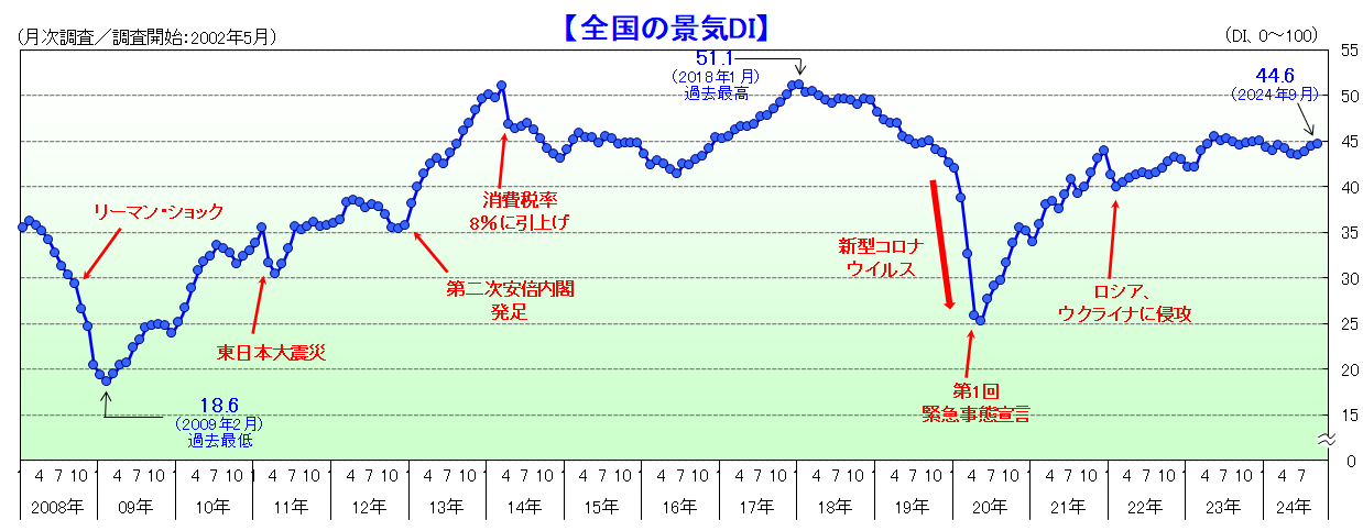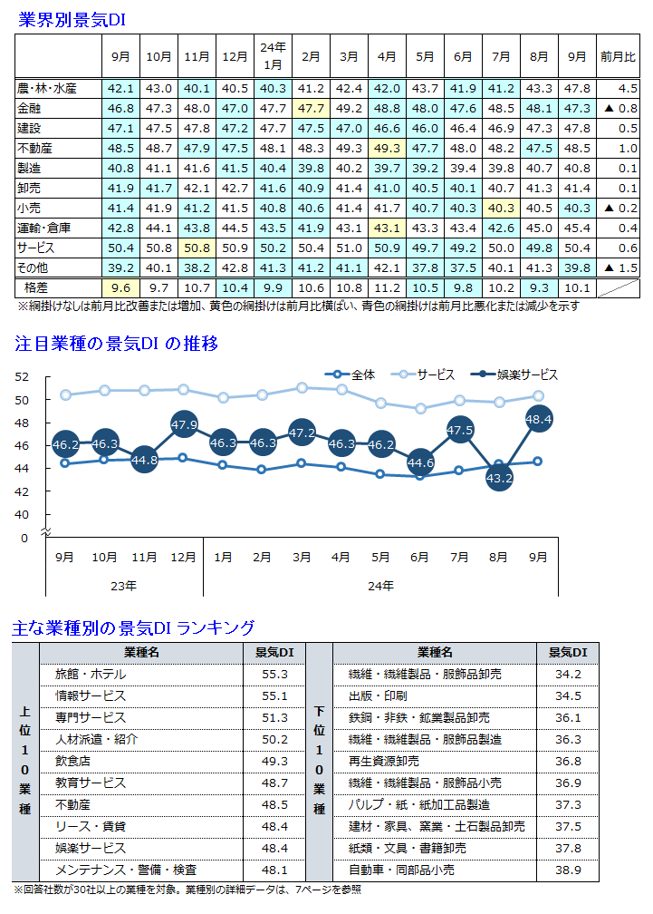 2024年9月の景気DIは前月比0.3ポイント増の44.6となり、3カ月連続で改善。