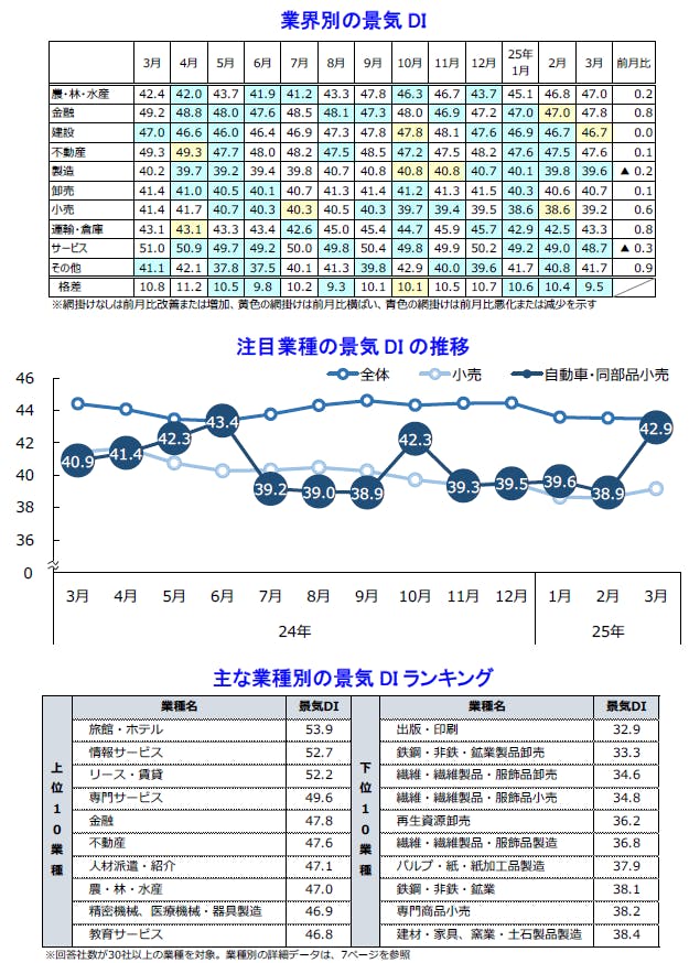 3月は、日経平均株価が31日に今年最大の下げ幅を記録するなど、金融市場で米国の経済政策変更による影響を大きく受けた。また、食品や原材料などの価格の高止まり、人材確保の困難さは、引き続き幅広い業種の収益を圧迫し、景況感を下押しした。