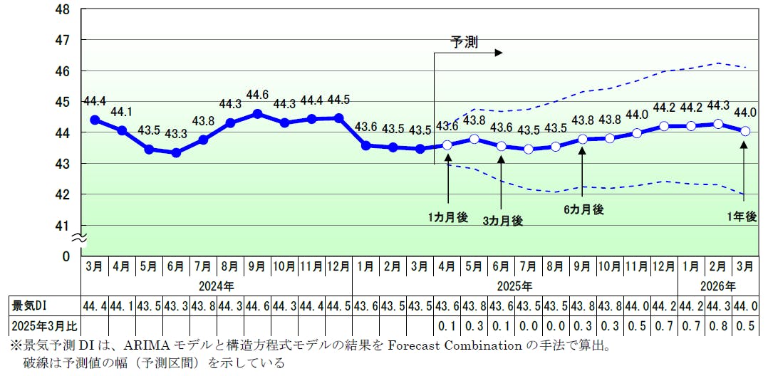 景気予測DIは、ARIMAモデルと構造方程式モデルの結果をForecast Combinationの手法で算出。破線は予測値の幅(予測区間)を示している