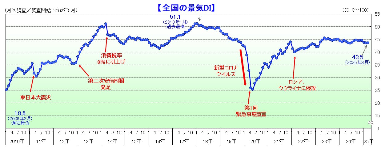2025年3月の景気DIは前月から横ばいの43.5となった。国内景気は、人出の増加が下支えしたが、食品や原材料の価格の高止まりが抑制要因となった。