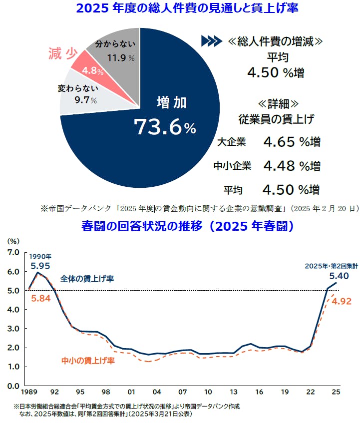 • 帝国データバンクが試算した賃上げ率は平均4.50%だった。連合の第2回集計結果は平均5.40%(中小企業は平均4.92%)