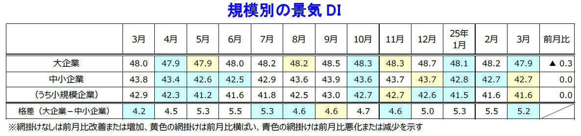 • 「大企業」は2カ月ぶりに悪化、「中小企業」「小規模企業」はともに横ばいだった。『不動産』で規模間のバラツキがみられた一方で、『サービス』は全規模で悪化した。規模間格差は5.2と4カ月ぶりに縮小した。