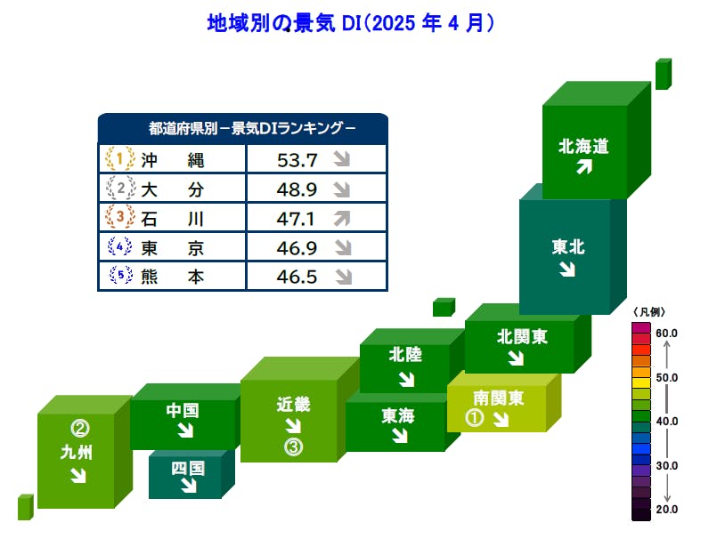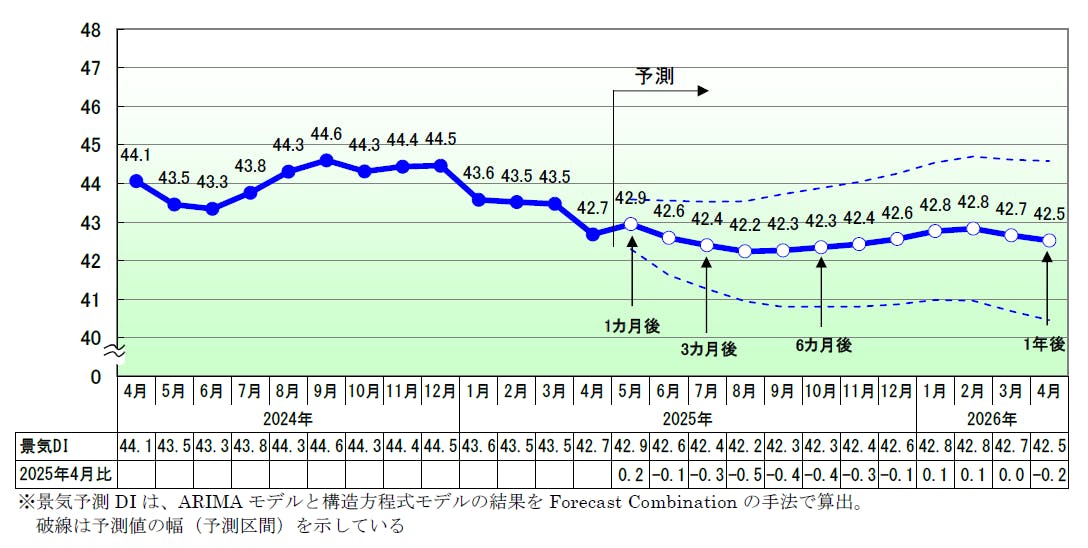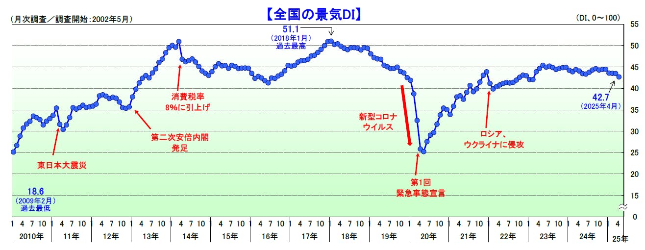 2025年4月の景気DIは前月比0.8ポイント減の42.7となり、2カ月ぶりに悪化した。国内景気は、米国の「トランプ関税」による自社の事業への悪影響など先行きの不安から個人消費も伸び悩み、景況感が急速に冷え込んだ。