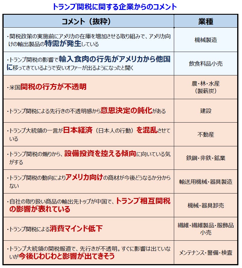 • トランプ関税に対して、先行き不安や警戒感の高まりを懸念する声のほか、徐々に影響が表れているといった声が多数寄せられた