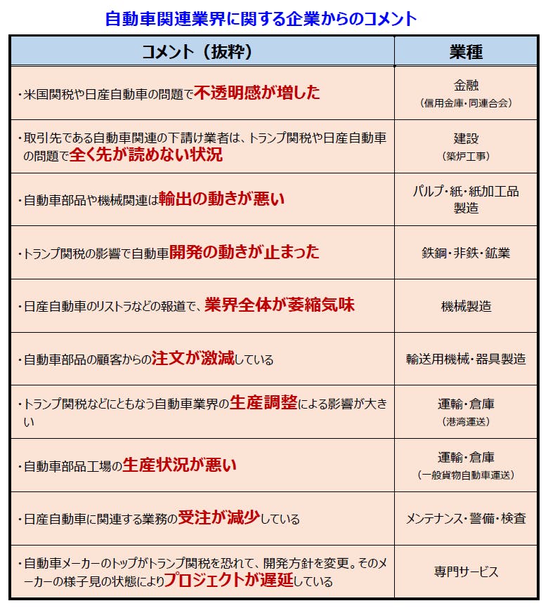 • トランプ関税の影響に加えて、日産自動車をはじめとする自動車業界の生産動向に危機感を表す声が多数寄せられた