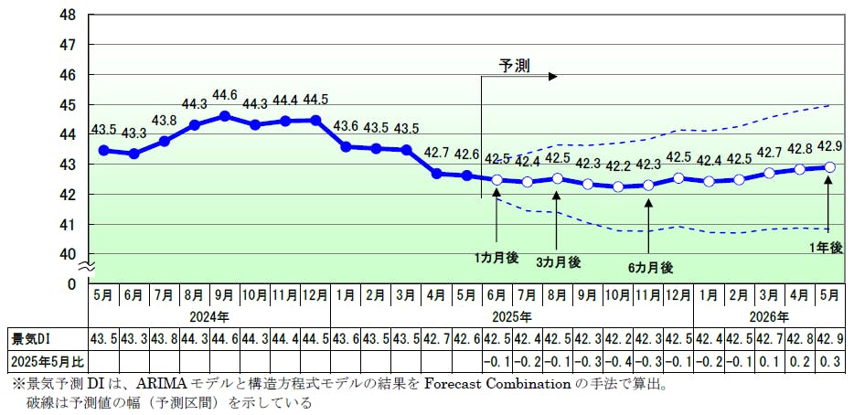景気予測DIは、ARIMAモデルと構造方程式モデルの結果をForecast Combinationの手法で算出。破線は予測値の幅(予測区間)を示している