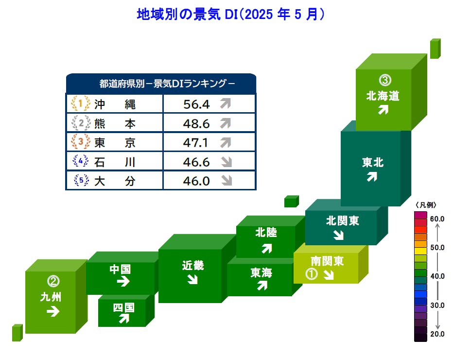2025年5月の景気DIは前月比0.1ポイント減の42.6となり、2カ月連続で悪化した。国内景気は、大型連休が下支えする要因となったものの、物価の上昇や「トランプ関税」への不安感が響き、力強さを欠く展開となった。