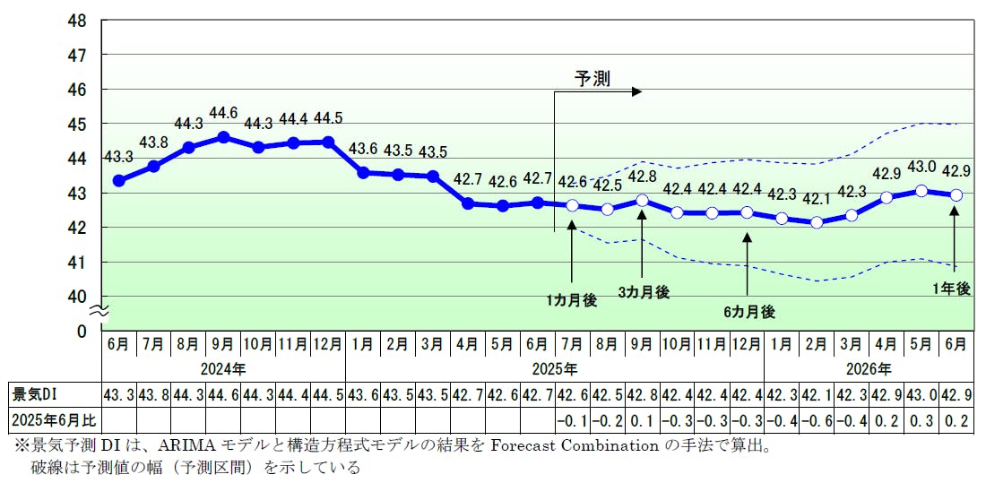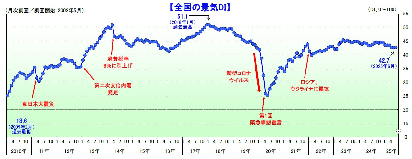 2025年6月の景気DIは前月比0.1ポイント増の42.7となり、小幅ながら6カ月ぶりに改善した。