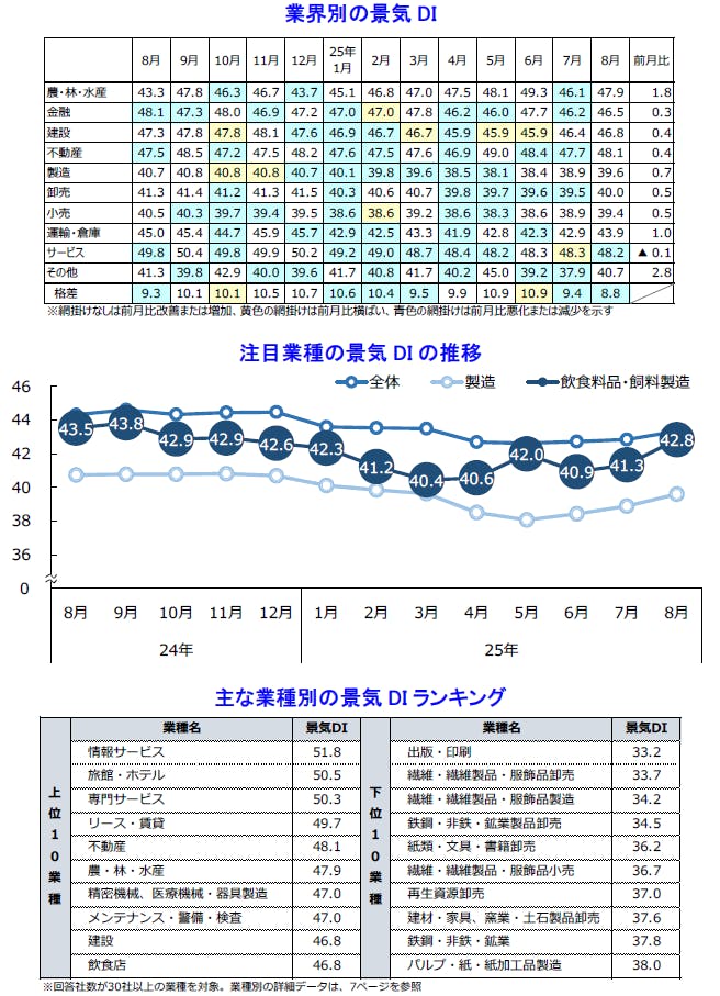 2025年8月の景気DIは前月比0.5ポイント増の43.3となり、3カ月連続で改善した。国内景気は、米国の関税政策に不確定要因が残るものの、猛暑による川上から川下までの特需や全国の建設需要がけん引し、上向き傾向が続いた。