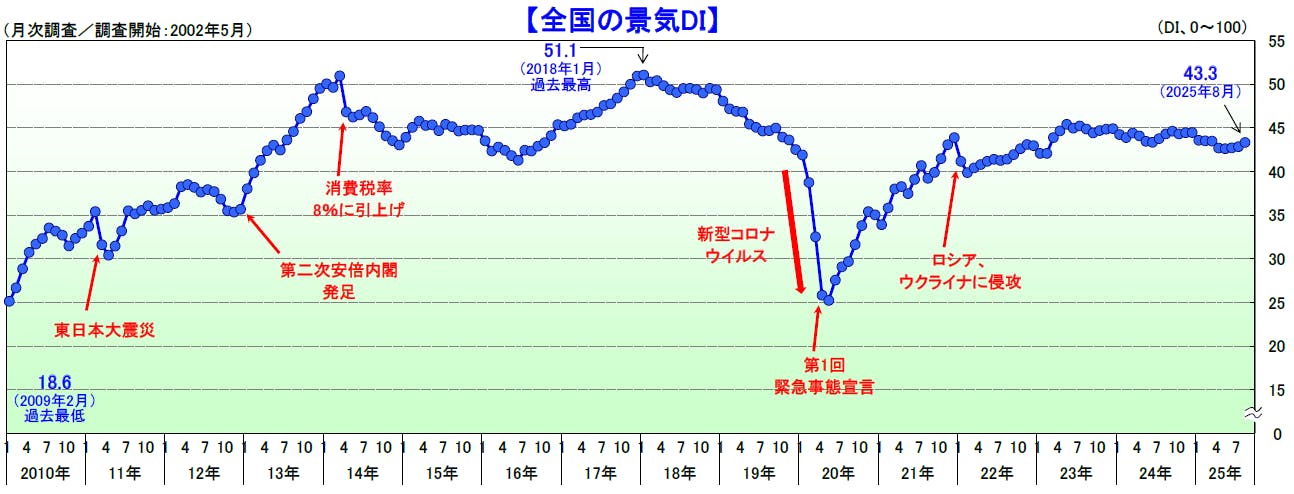 1. 2025年8月の景気DIは前月比0.5ポイント増の43.3となり、3カ月連続で改善した。国内景気は、米国の関税政策に不確定要因が残るものの、猛暑による川上から川下までの特需や全国の建設需要がけん引し、上向き傾向が続いた。今後の国内景気は、実質賃金の行方を見極めつつ、当面は横ばい圏での推移が見込まれる。