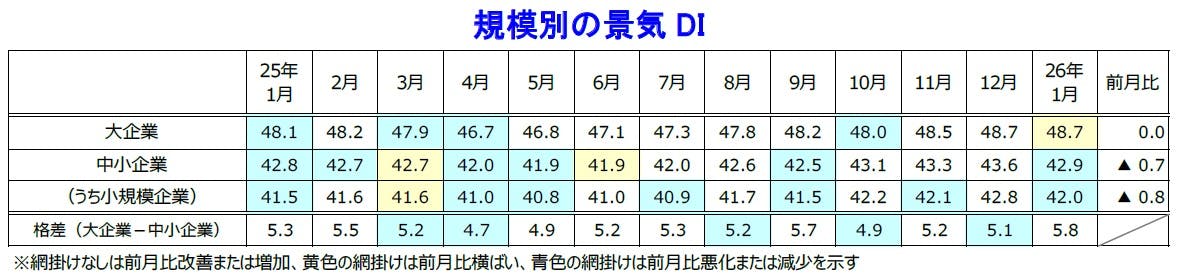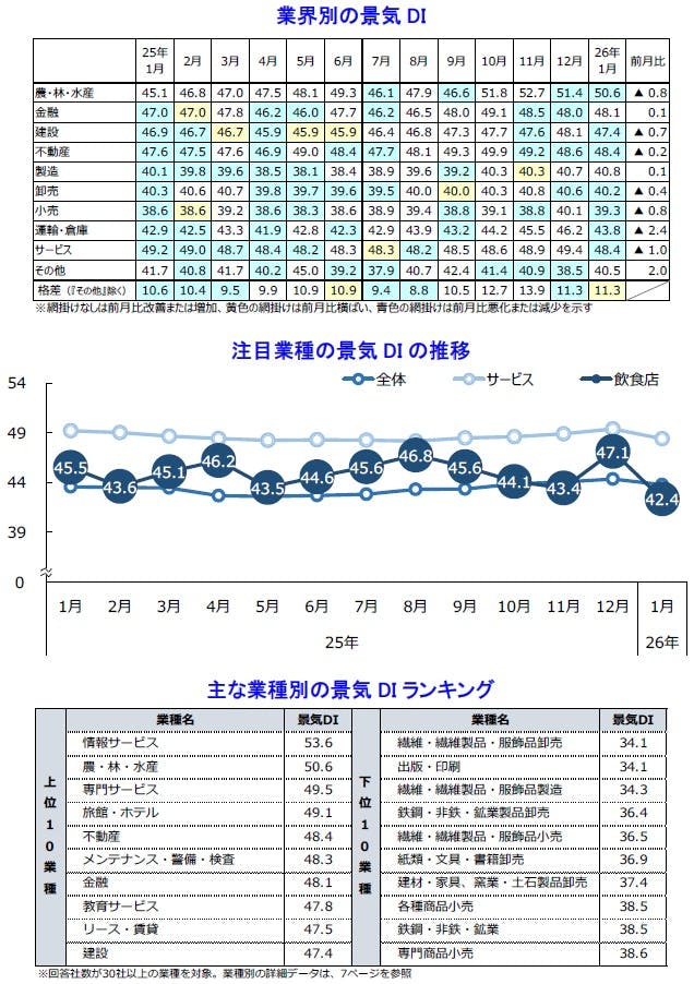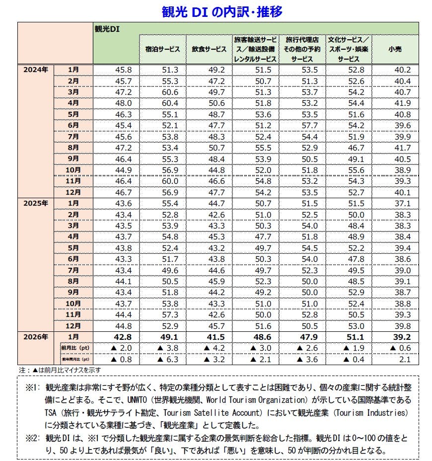 2026年1月の景気DIは前月比0.6ポイント減の43.8となり、8カ月ぶりに悪化した。国内景気は、年末商戦や旅行需要の反動が表れ、改善基調のなかでいったん足踏みとなった。