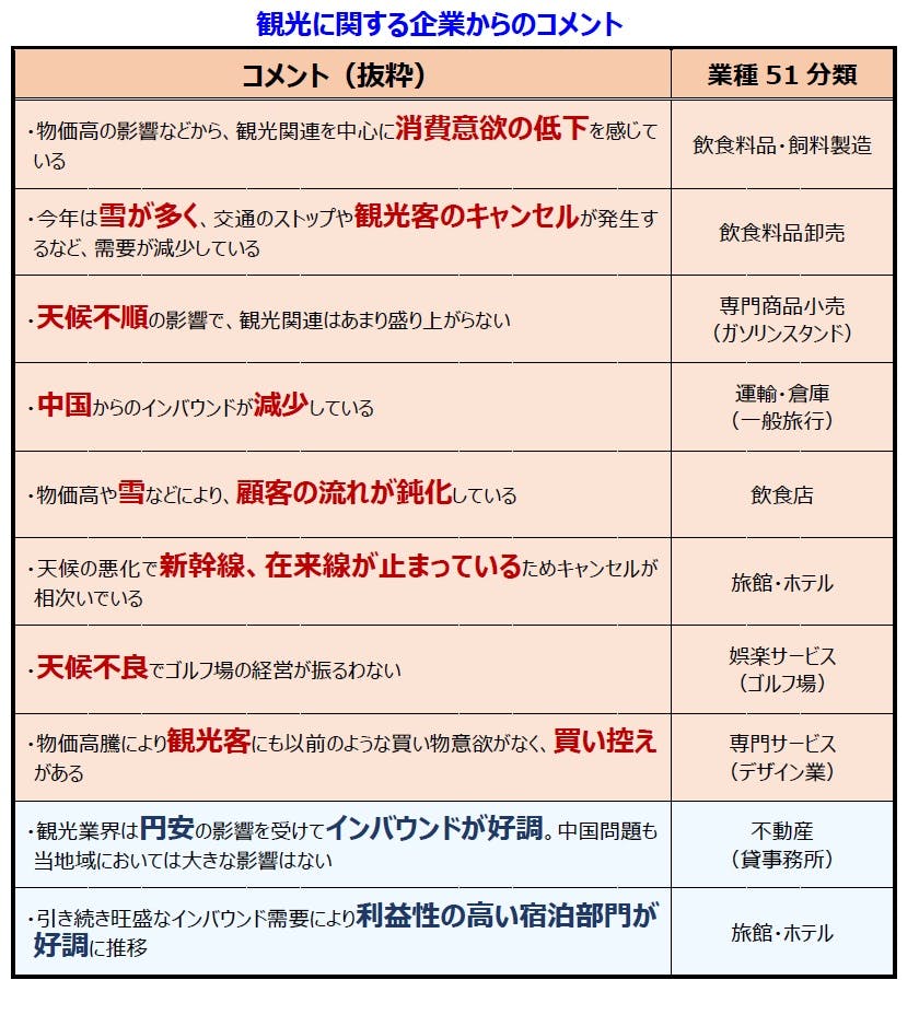 • 大雪など天候不順の影響や中国からの訪日客減少を危惧する声が複数寄せられた