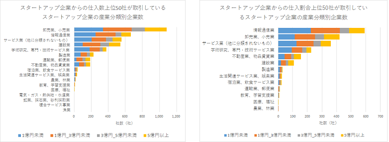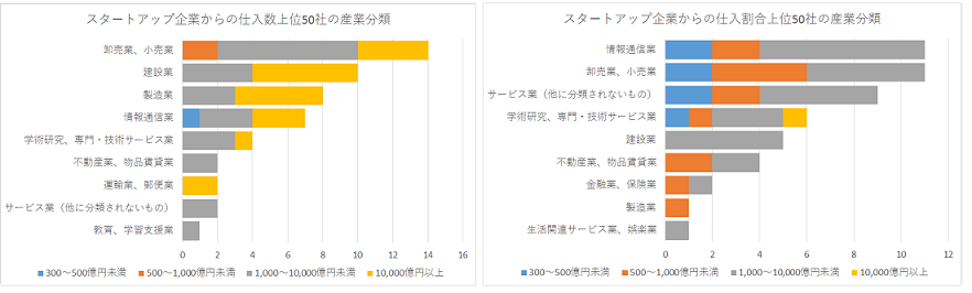 さらに、売上高規模と産業特性をより細かく見ていきます。図表6は、図表5で抽出した50社を、産業分類ごとに社数を集計し、その売上高規模を内訳としたものです。図表5と同様、スタートアップ企業からの仕入数上位50社と、スタートアップ企業からの仕入割合上位50社を、それぞれ分析の対象としています。