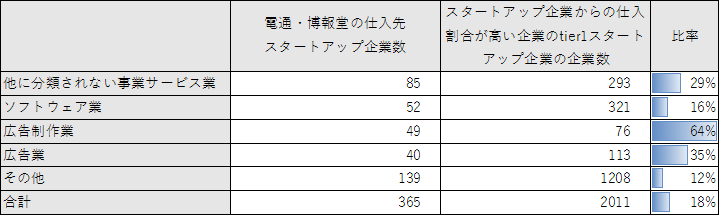 図表9 電通または博報堂の仕入先となっているスタートアップ企業数。大手企業との取引のあるスタートアップ企業の業種分布と比率をとると、広告制作業では多くのスタートアップ企業が電通または博報堂と取引を行っていることが分かる(帝国データバンク企業概要データベース「COSMOS2」より作成)