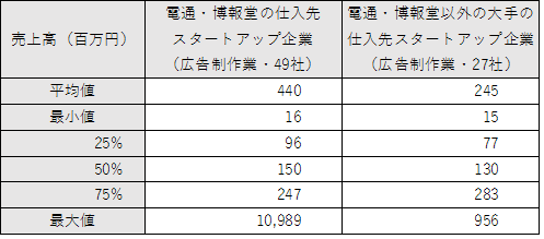電通や博報堂との取引の有無がスタートアップ企業の規模にどの程度影響を与えるかを見るため、取引の有無で広告制作業のスタートアップ企業を分け、売上高規模の統計値をまとめました(図表10)。売上高の平均値・最小値・25%点・50%点・最大値は電通・博報堂との取引のある企業群の方が高いことが分かります。電通・博報堂の寡占状態にある広告業界では、多くのスタートアップ企業はこの2社との取引を行っていることと、この取引がスタートアップ企業の成長に影響を与えていることが示唆されます。