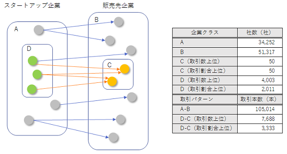 図表1.本分析での分析対象企業グループの構成法。スタートアップ企業の集合Aを定め、その販売先の集合Bを構成する。B内の企業から、特にスタートアップ企業との関わりが深いと思われる企業を抽出し、集合Cを構成する。最後に、実際にCに販売を行っているスタートアップ企業の集合Dを構成する。本分析ではCの構成法として2つの方法を用いた。ひとつはスタートアップ企業からの仕入本数が多い企業上位50社をCとする方法、もうひとつはスタートアップ企業からの仕入割合が多い企業上位50社をCとする方法である。これにともないDも2種類構成される。(帝国データバンク作成)