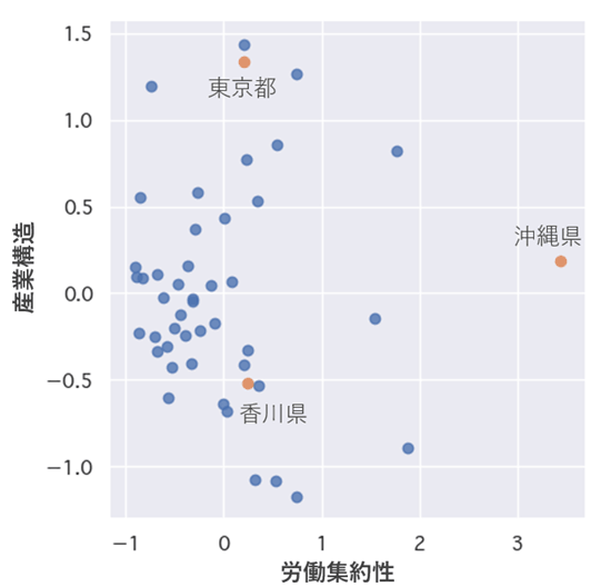 全体として、左側やや下に点が密集している傾向が見て取れるだろう。この傾向を踏まえたとき、東京都は左上に、沖縄県は右側にいるため例外的な立ち位置にあり、しかもお互いに対極的な性格であるといえる。これとは対照的に、香川県は左下にいるため、典型例に近い立ち位置にあるといえるだろう。