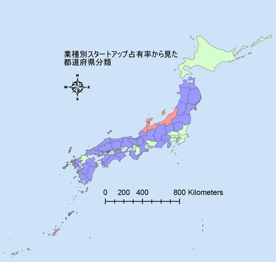 図表6 スタートアップ占有率の業種分布パターンから導出した都道府県の3類型。大都市近傍(緑)、郊外(青)、北陸及び沖縄(赤)に分かれる(出典:帝国データバンク作成)