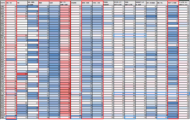 図表4 スタートアップ占有率(単位:パーセント)の都道府県と業種に関するクロス集計表。赤いほど割合が高く、青いほど割合が低い。全地域で現れる特徴(赤枠)と地域特性が現れる特徴(青枠)がある。(出典:帝国データバンク作成)