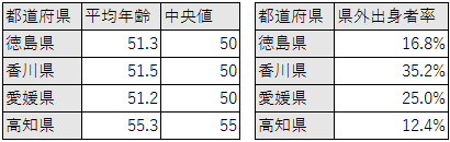 が仮説として考えられる。与えられた環境に対して通常と異なる反応をしやすいのは、その環境において経験の浅い若者か、他の環境を経験したことがある人々だろうと考えられるからだ。以下、企業概要データベースの代表者特性からこれらの仮説を支持しうるかを考えたい。仮説を検証するため、四国の他県(徳島県・愛媛県・高知県)と比較した。