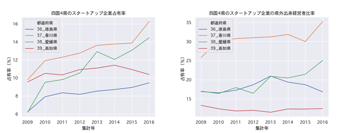 さらに四国4県について、この仮説に関する時系列推移を見たのが図表2である。徳島県を除き、スタートアップ占有率(左)とスタートアップ企業の県外出身経営者比率(右)がほぼ連動していることが分かるだろう。県外出身者の比率がスタートアップ企業の数と何らかの関係があることはもっともらしいことといえる。