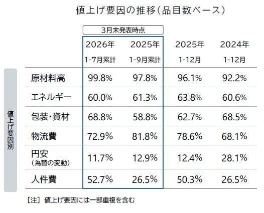 値上げ要因では、特に原材料などモノ由来の値上げが多くを占めた。「原材料高」の影響を受けた値上げは99.8%となり、集計を開始した2023年以降で最多だった。値上げ要因で前月から上昇したものは、電気・ガスなどの「エネルギー」(60.0%)、トラックドライバーの時間外労働規制などが要因となった輸送コストの上昇分を価格に反映する「物流費」(72.9%)、「円安(為替の変動)」(11.7%)の4要因だった。なかでも「円安」は前月(3.3%)から大幅に上昇した。他方、「人件費」由来の値上げは52.7%を占め、過去4年で最高水準での推移となったものの、前月からは低下した。「包装・資材」(68.8%)も前月を下回ったものの、パッケージやトレーなどの値上げによる影響を受け、年間としては過去4年間で最高水準での推移となった。